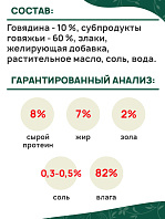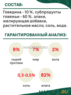 Говядина - 10 %, субпродукты говяжьи - 60 %, злаки, желирующая добавка, растительное масло, соль, вода.