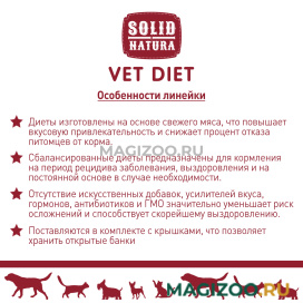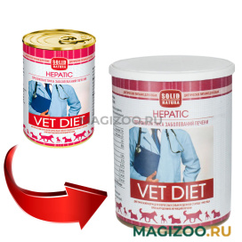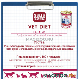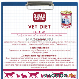 Solid Natura VET Hepatic - влажный диетический корм, предназначенный для собак всех пород и возрастов при нарушениях функции печени. По ингредиентному составу относится к кормам суперпремиум класса.
