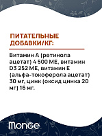 Мясо индейки, мясо курицы, рис, печень куриная, кукурузная мука, сухое цельное молоко, яйцо, рыбий жир, подсолнечное масло, минералы.