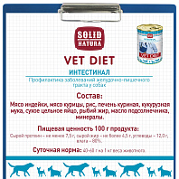 Solid Natura VET Intestinal - влажный диетический корм, предназначенный для собак всех пород и возрастов при нарушениях работы желудочно-кишечного тракта. По ингредиентному составу относится к кормам суперпремиум класса.