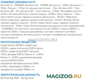 Пищевые добавки на 1 кг: Витамин A – 15000 МЕ; витамин D3 – 1500 МЕ; витамин E – 600 мг; витамин C – 150 мг; ниацин - 37,5 мг; D-кальция пантотенат – 15 мг; витамин B2 - 7,5 мг; витамин B6 – 6 мг; витамин B1 - 4,5 мг; биотин - 0,38 мг; фолиевая кислота - 0,45 мг; витамин B12 0,1 мг; холина хлорид – 2500 мг; бета-каротин - 1,5 мг; цинк (хелат цинка гидрокси-аналога метионина) - 163,8 мг; марганец (хелат марганца гидрокси-аналога метионина) - 64,6 мг; железо (хелат железа гидрата глицина) - 58,3 мг; медь (хелат меди гидрокси-аналога метионина) - 15,8 мг; селен (селенизированные дрожжи инактивированные) - 0,00088 мг; DL метионин, технически чистый 4000 мг; таурин 1000 мг; L-карнитин 300 мг.