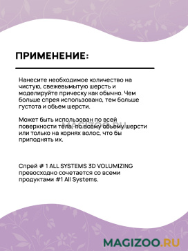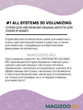 # 1 ALL SYSTEMS 3D VOLUMIZING – это спрей для увеличения объема шерсти Вашего питомца.