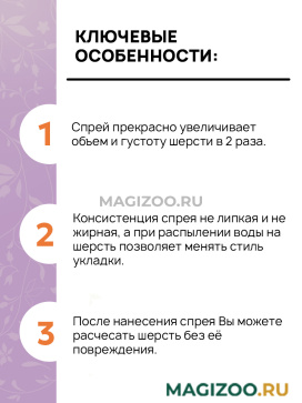 - Консистенция спрея не липкая и не жирная, а при распылении воды на шерсть позволяет менять стиль укладки.