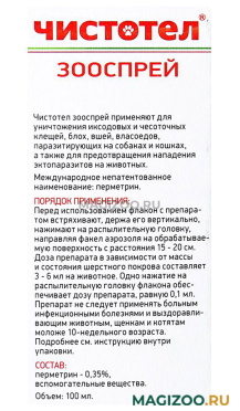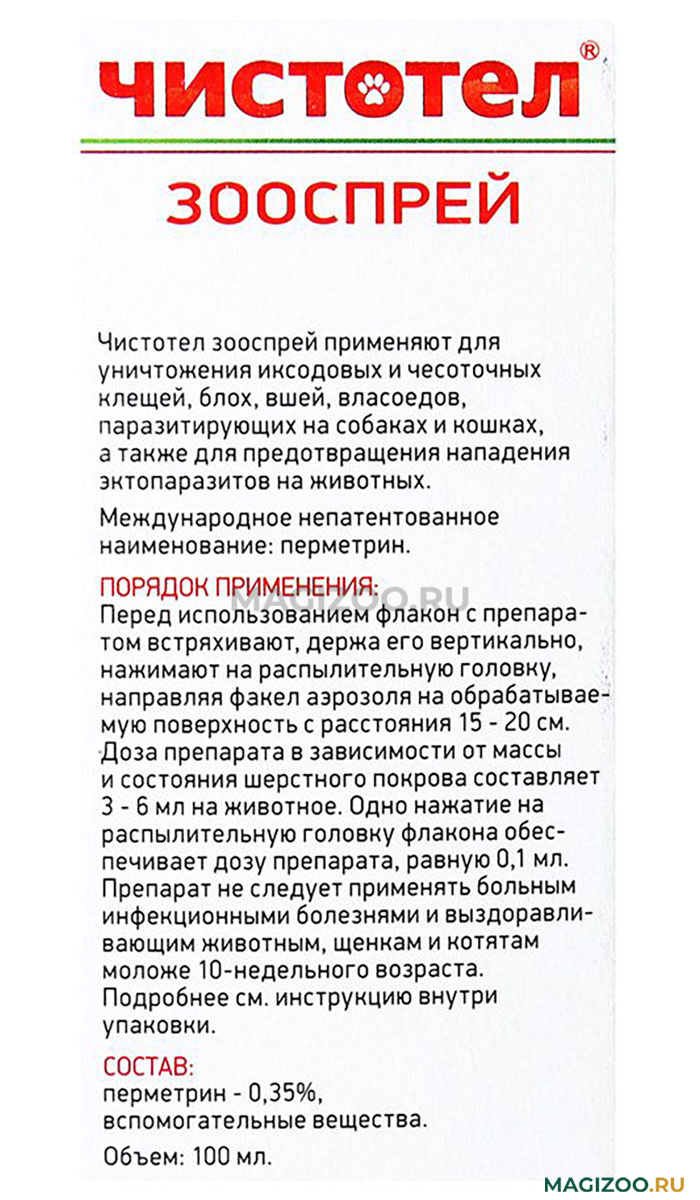 В целях уничтожения эктопаразитов в помещении и предотвращения повторной инфестации животных будки, клетки, подстилки и попоны обрабатывают Чистотел зооспреем из расчета 2 мл на 1 кв. м обрабатываемой поверхности.