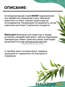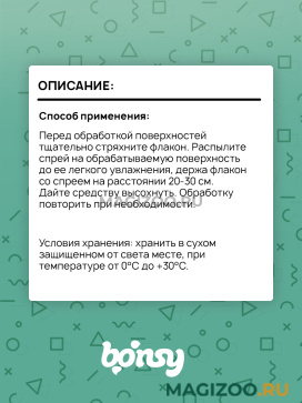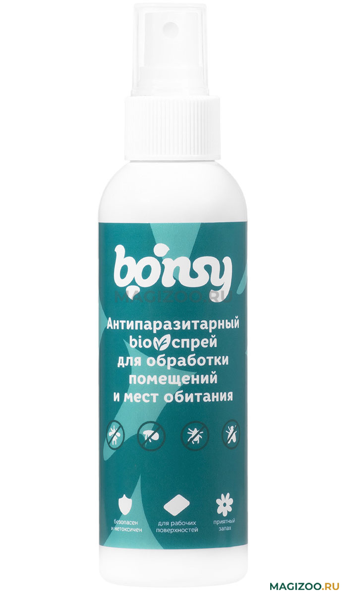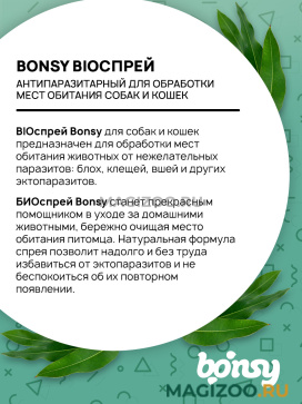 Антипаразитарный спрей BONSY предназначен для обработки помещений и мест обитания животного от блох, клещей, вшей и других эктопаразитов. Рекомендуется применять, когда животное достигает 3-месячного возраста.