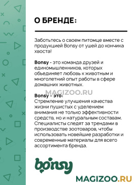 • Эффективность для питомца, эстетичность для владельца. Bonsy предусмотрели современные оттенки для линейки аксессуаров, сделали удобные и эргономичные флаконы, а так же разработали приятные ароматы для серии косметических товаров, запахи которых не вредят острому обонянию животных.