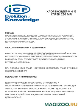 Дезинфицирующее средство по отношению к грамположительным и грамотрицательным бактериям, для обработки больших участков кожи. Может дополнять и усиливать эффект применения Хлорэксидерм Шампунь 4%. Местное воздействие на дерматофиты. Локальный дезинфектант.