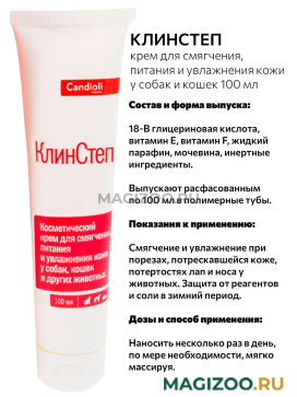 Крем для смягчения, питания и увлажнения кожи у кошек, собак и других животных. Правильно подобранные компоненты КлинСтеп обеспечивают смягчающее воздействие на поверхность кожи, особенно при наличии мозолей, способствуют их удалению и возвращению коже здорового состояния.