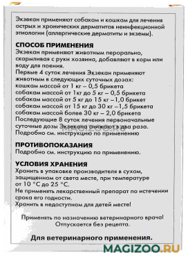 Экзекан назначают внутрь, скармливая с руки хозяина, или принудительно в смеси с кормом или питьевой водой первые 4 суток в суточных дозах: