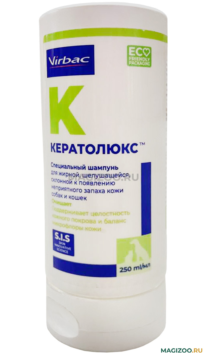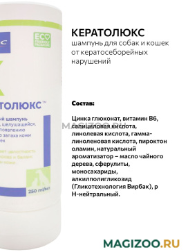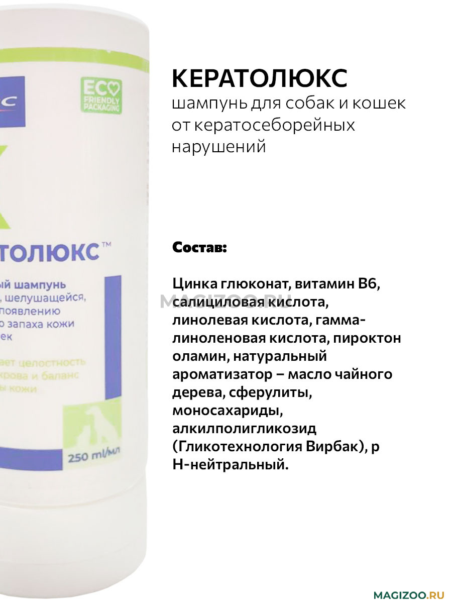 Уникальная формула шампуня содержит комбинацию салициловой кислоты, цинка глюконата, витамина В6, пироктон оламина и незаменимых жирных кислот, которые позволяют избавить животное от перхоти, способствуют нормализации работы сальных желез.Шампунь Кератолюкс содержит специальную, разработанную лабораторией Virbac, формулу, содержащую моносахариды и алкилполигликозиды.