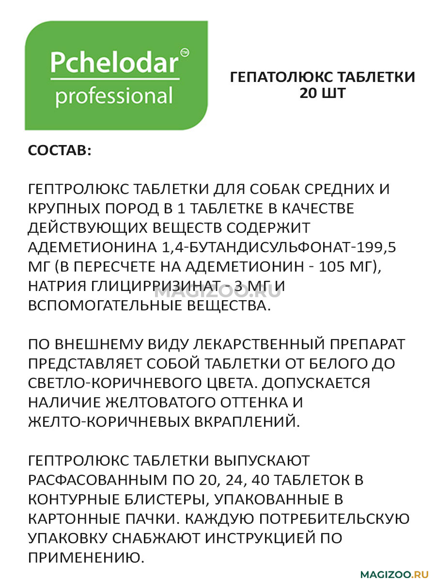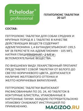 Гептролюкс таблетки для собак средних и крупных пород в 1 таблетке в качестве действующих веществ содержит адеметионина 1,4-бутандисульфонат-199,5 мг (в пересчете на адеметионин - 105 мг), натрия глицирризинат - 3 мг и вспомогательные вещества.