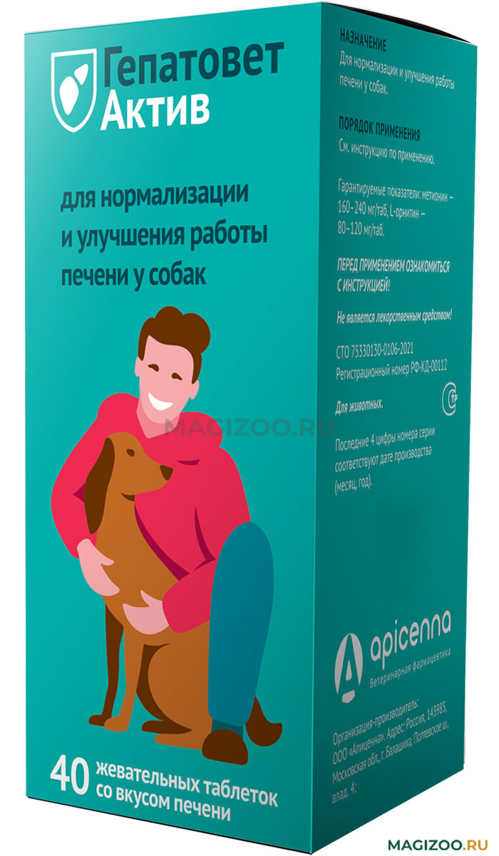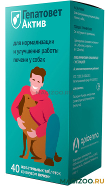Гепатовет Актив жевательные таблетки применяют для нормализации и улучшения работы печени и желчного пузыря у собак. Возможно применение для снижения нежелательного токсического влияния лекарственных средств.