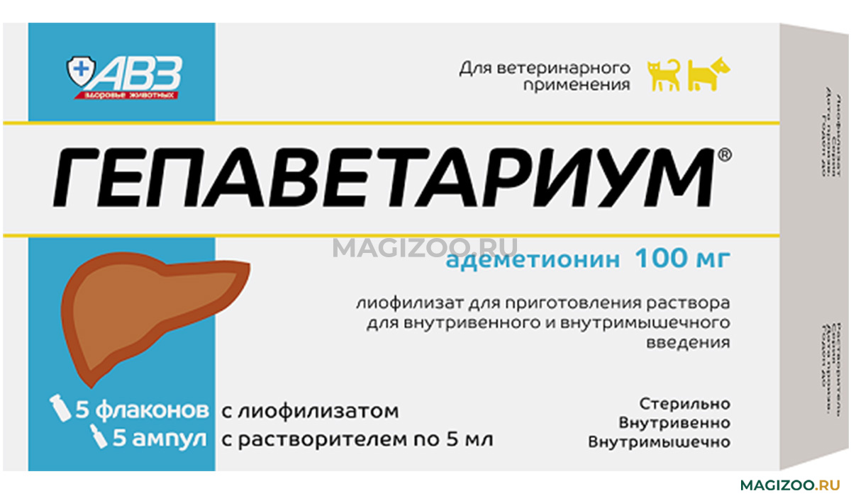 ГЕПАВЕТАРИУМ - лиофилизат для приготовления раствора для инъекций с растворителем. Препарат применяют собакам и кошкам для снижения отрицательного влияния лекарственных средств, обладающих гепатотоксичностью, при гепатитах различного генеза: вирусные, токсические; жировой дистрофии печени; при хроническом не калькулёзном холецистите, холангите; внутрипечёночном холестазе.