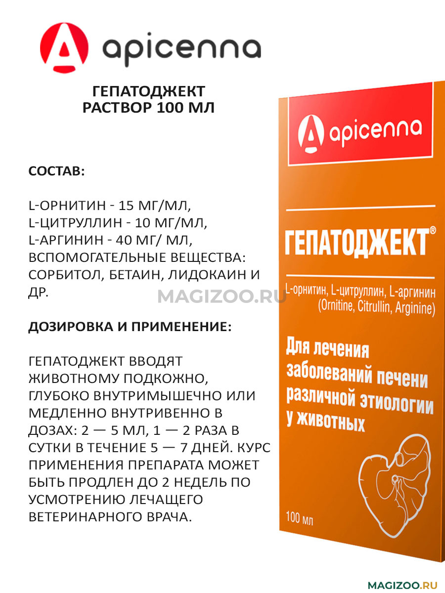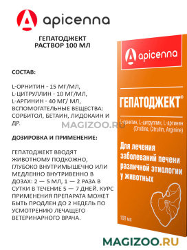 11. Гепатоджект назначают животным самостоятельно или в составе комплексной терапии при острых и хронических заболеваниях печени различной этиологии, в целях нормализации функции и регенерации клеток печени после эндо- и экзотоксикозов, соматических и инфекционных заболеваний, а также для снижения гепатотоксического действия лекарственных средств.