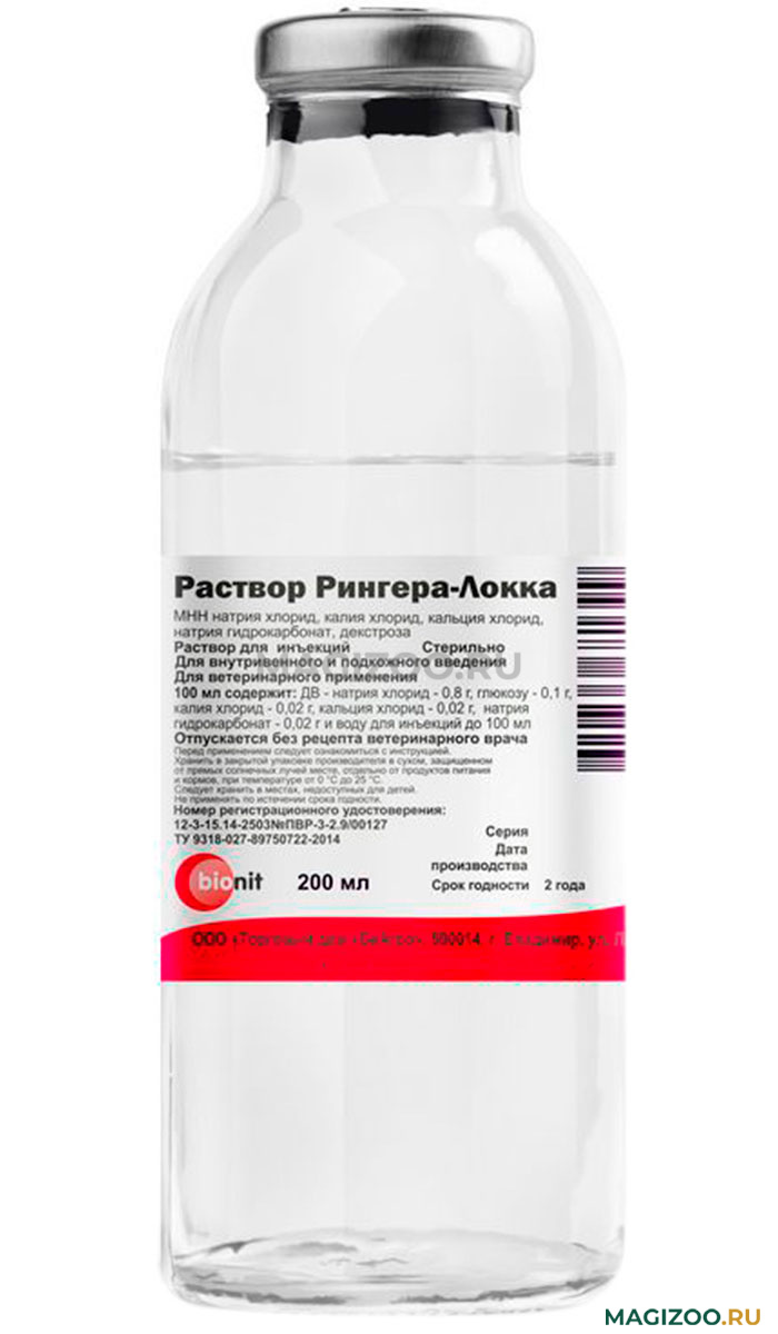 14. В рекомендуемых дозах раствор Рингера-Локка не вызывает у животных побочного действия и осложнений. Применять с осторожностью при почечной и сердечной недостаточности.