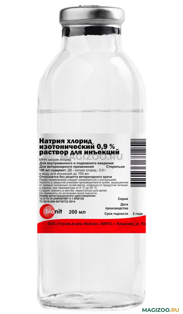 Натрия хлорид изотонический 0,9 % раствор для инъекций применяют животным при больших потерях организмом жидкости (кровотечения, токсическая диспепсия), явлениях шока, интоксикациях, метритах, вагинитах, а также для растворения различных лекарственных препаратов.