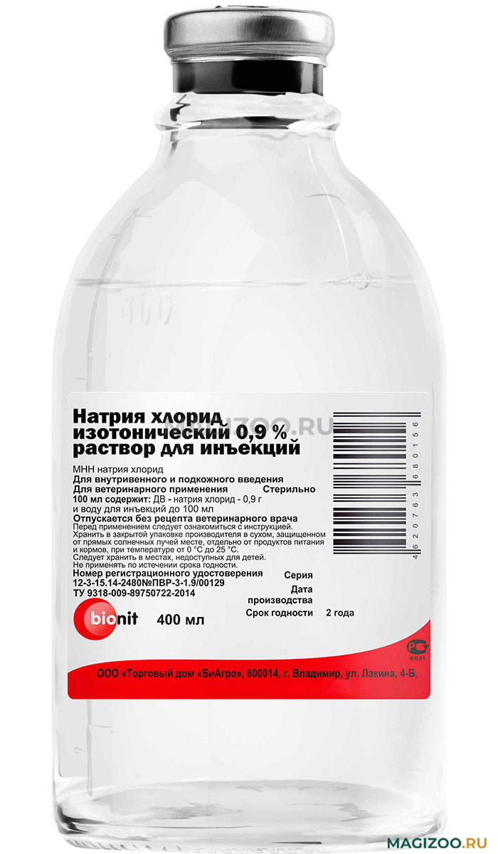 8. Натрия хлорид изотонический 0,9 % раствор для инъекций применяют животным при больших потерях организмом жидкости (кровотечения, токсическая диспепсия), явлениях шока, интоксикациях, метритах, вагинитах, а также для растворения различных лекарственных препаратов.