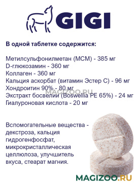 В одной таблетке содержится: метилсульфонилметан (МСМ) - 385 мг, D-глюкозамин - 360 мг, коллаген - 360 мг, кальция аскорбат (витамин Эстер С) - 96 мг, хондроитин 90% - 80 мг, экстракт босвелии (Boswellia PE 65%) - 24 мг, гиалуроновая кислота - 20 мг, вспомогательные вещества - декстроза, кальция гидрогенфосфат, микрокристаллическая целлюлоза, улучшитель вкуса, стеарат магния.