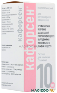 Кафорсен назначают собакам, кошкам, кроликам, крупному рогатому скоту, лошадям в комплексной терапии заболеваний, сопровождающихся нарушением минерального обмена веществ, в том числе: