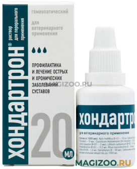 Хондартрон обладает противовоспалительным, обезболивающим, хондропротективным и регенерирующим действием при заболеваниях опорно-двигательного аппарата. Входящие в состав Хондартрона гомеопатические компоненты воздействуют избирательно на фиброзные ткани (сухожилия, связки, фасции), уменьшая застойные явления в них, снимают отек, способствуют исчезновению боли, а также избирательно действуют на костную ткань, ускоряя сращение костных отломков и образование костной мозоли, восстанавливают обмен веществ в пораженном суставе, улучшают его питание и кровоснабжение, а также предотвращают разрушение хряща и деформацию сустава. По степени воздействия на организм теплокровных животных препарат относится к малоопасным веществам, не обладает местнораздражающим и сенсибилизирующим действием. Гомеопатические компоненты, входящие в состав Хондартрона в сверхмалых дозах, не накапливаются в организме животного.