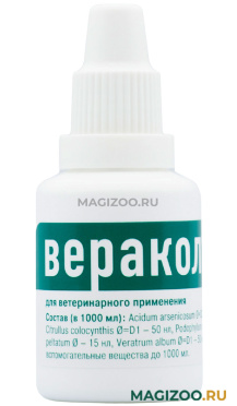 Гомеопатический препарат Веракол содержит в качестве действующих веществ (на 1000 мл): Veratrum album Ø=D1 – 0,05 мкл; Acidum arsenicosum Ø=D2 – 5 нл; Podophyllum peltatum Ø – 0,015 мкл; Citrullus colocynthis Ø=D1 – 0,05 мкл и вспомогательные вещества: спирт этиловый 96% – 93,8 мл и воду очищенную до 1000 мл. Препарат выпускают в форме прозрачного бесцветного раствора для перорального применения, расфасованным по 20 мл в пластиковые флаконы с капельницами.