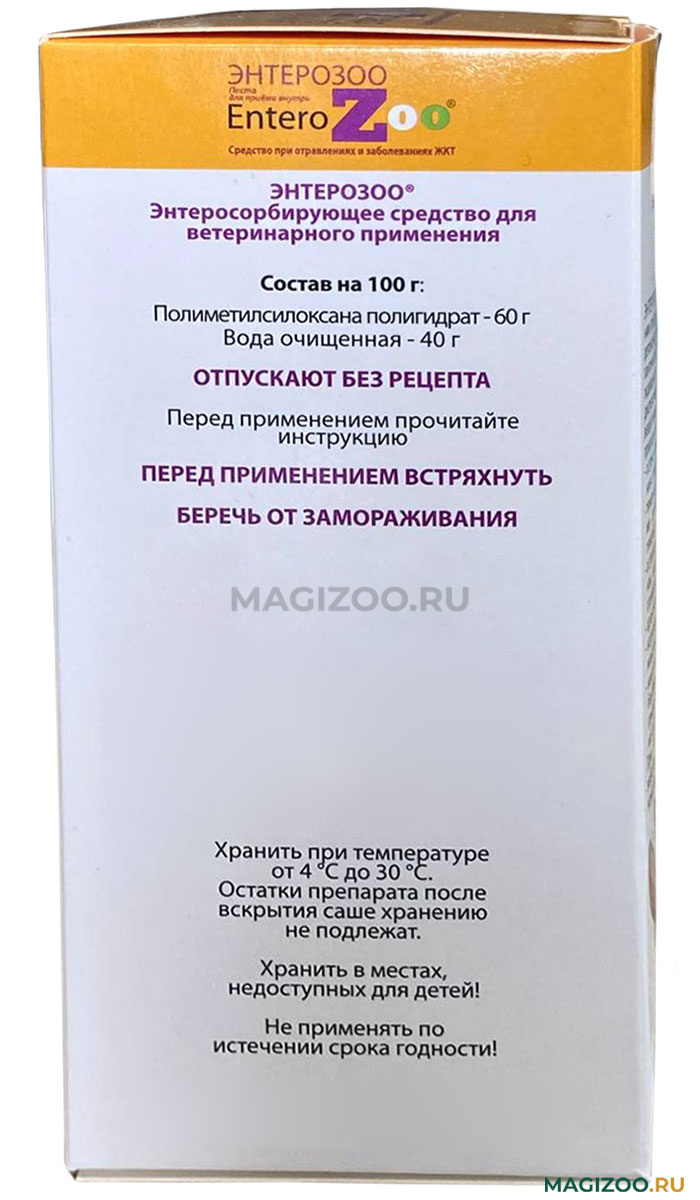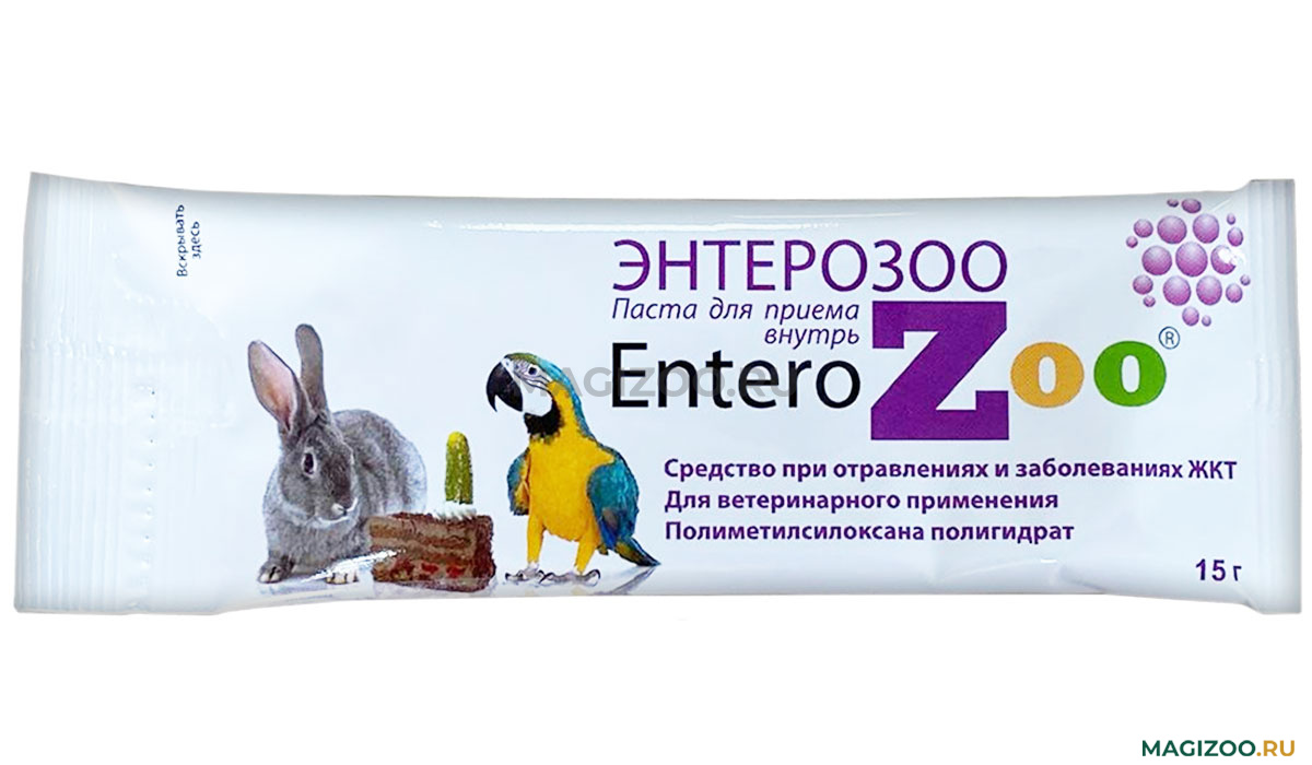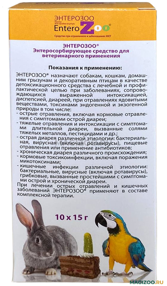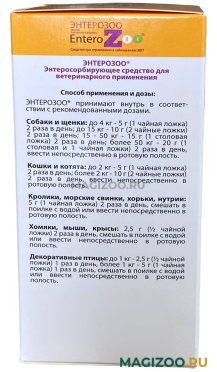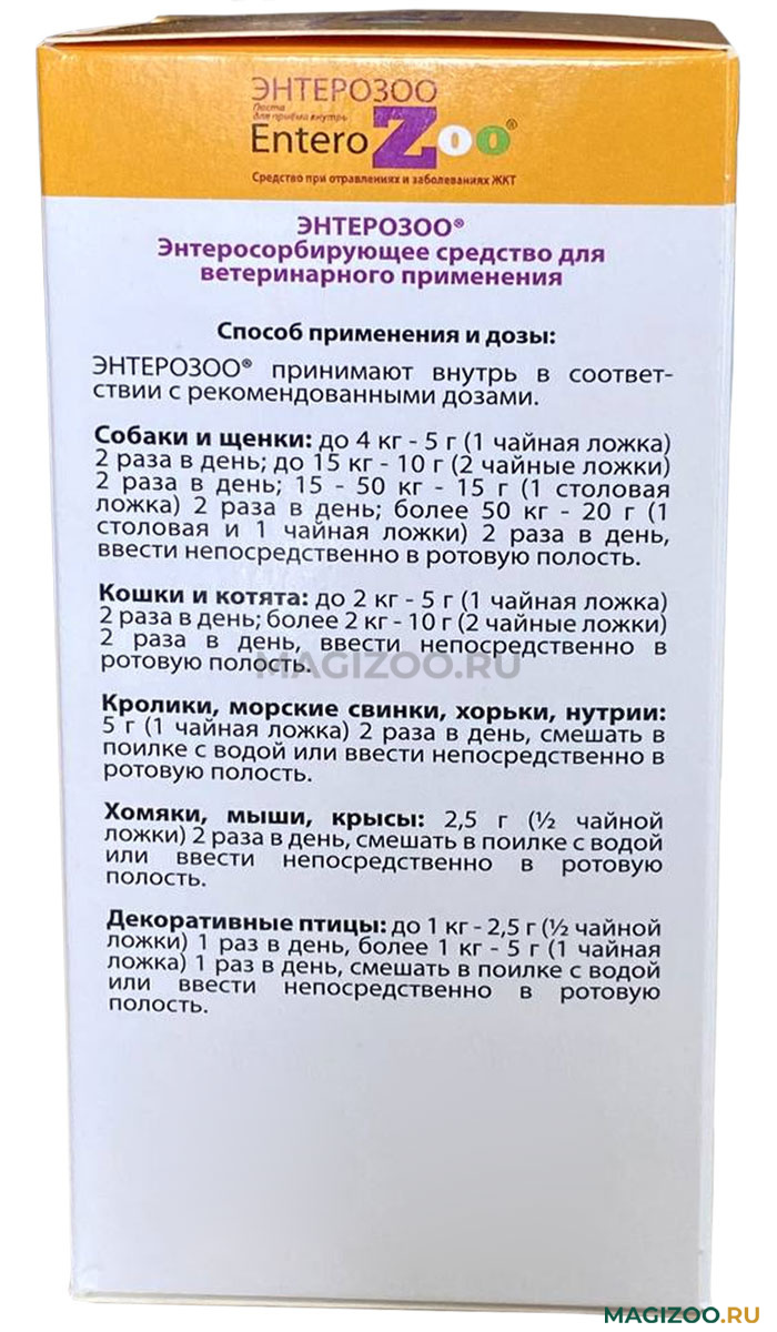 ЭНТЕРОЗОО полностью безопасен, не усваивается организмом и может применяться для беременных и кормящих самок или их детенышей.