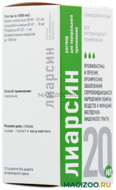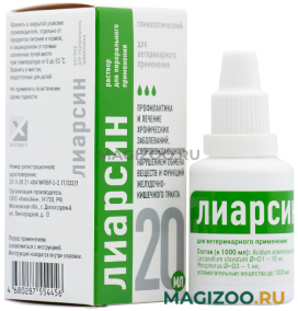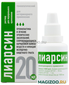 Лиарсин пероральные капли задают животным внутрь индивидуально при острых гастритах и гастроэнтеритах 4 – 6 раз в день до исчезновения клинических признаков; для достижения максимально быстрого эффекта — каждые 15 минут в течение 2 часов. При хронических заболеваниях 2 – 3 раза в день до появления положительного эффекта. Длительность курса лечения устанавливается ветеринарным врачом, но не более 1 месяца.