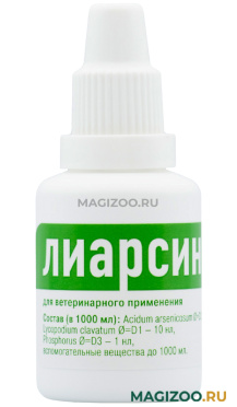 Лиарсин обладает регулирующим действием на белковый, углеводный, жировой обмен веществ, восстанавливает нарушенные функции желудочно-кишечного тракта. По степени воздействия на организм теплокровных животных препарат относится к малоопасным веществам, не обладает местнораздражающим и сенсибилизирующим действием. Гомеопатические компоненты, входящие в состав Лиарсина в сверхмалых дозах, в организме животного не накапливаются.