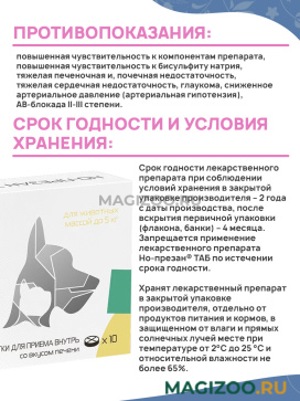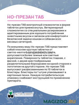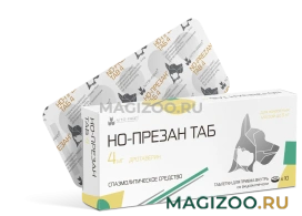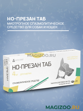 Но-презан ТАБ миотропный спазмолитик в форме таблеток для приема внутрь. Ветеринарный спазмолитик со специальными дозировками и адаптированным для хорошего потребления животными вкусом и запахом для комфортной и безопасной задачи кошкам и собакам всех весовых категорий.