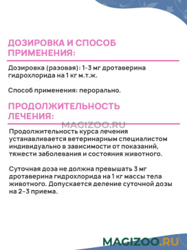 Суточная доза не должна превышать 3 мг дротаверина гидрохлорида на 1 кг массы тела животного. Допускается деление суточной дозы на 2–3 приема.