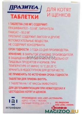 Котятам и щенкам с лечебной целью назначают Празител таблетки для котят и щенков в дозе 1 таблетка на 1 кг массы животного. Профилактическую дегельминтизацию котят проводят 1 раз в 3 месяца, начиная с 3-х недельного возраста. Профилактическую дегельминтизацию щенков проводят в возрасте 2-х недель, далее в 4-6 недель, в 6 месяцев в зависимости от схемы вакцинации.