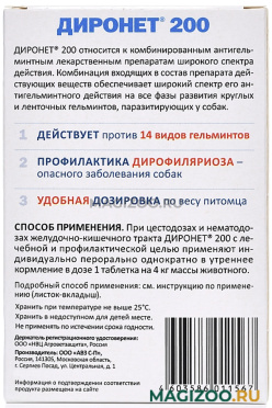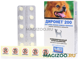 Диронет® 200 для собак мелких пород и щенков, содержит в одной двояковыпуклой таблетке пирантела памоат 60 мг, празиквантела 20 мг и ивермектина 0, 024 мг. Доза - 1 таблетка на 4 кг массы тела животного.
