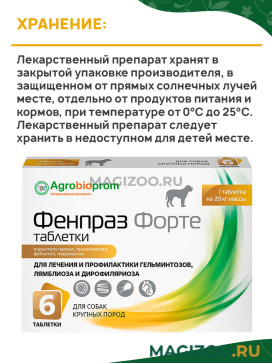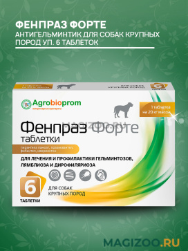 Фенпраз Форте таблетки для собак крупных пород с содержанием в 1 таблетке, рассчитанной на 20 кг массы животного, действующих веществ: пирантела памоата - 288 мг, празиквантела - 100 мг, фебантела - 300 мг, ивермектина - 0,12 мг.