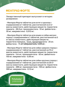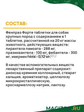 - Фенпраз Форте таблетки для собак крупных пород с содержанием в 1 таблетке, рассчитанной на 20 кг массы животного, действующих веществ: пирантела памоата - 288 мг, празиквантела - 100 мг, фебантела - 300 мг, ивермектина - 0,12 мг.