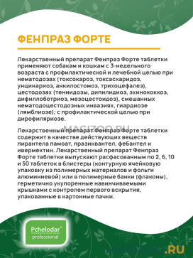 Лекарственный препарат Фенпраз Форте таблетки применяют собакам и кошкам с 3-недельного возраста с профилактической и лечебной целью при нематодозах (токсокароз, токсаскаридоз, унцинариоз, анкилостомоз, трихоцефалез), цестодозах (тениидозы, дипилидиоз, эхинококкоз, дифиллоботриоз, мезоцестоидоз), смешанных нематодоцестодозных инвазиях, гиардиозе (лямблиозе); с профилактической целью при дирофиляриозе.