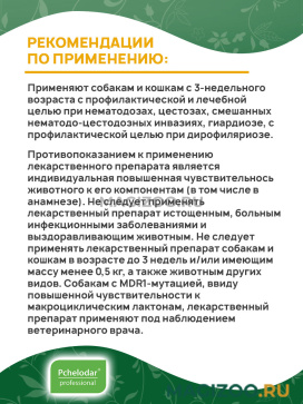 Применяют собакам и кошкам с 3-недельного возраста с профилактической и лечебной целью при нематодозах, цестозах, смешанных нематодо-цестодозных инвазиях, гиардиозе, с профилактической целью при дирофиляриозе.