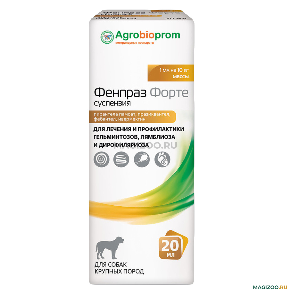 Фенпраз форте суспензия для собак средних, крупных пород содержит в 1 мл (на 4 кг веса) в качестве действующих веществ: пирантела памоат - 56 мг, празиквантел - 20 мг, фенбендазол - 6 мг, ивермектин – 0,024 мг, а в качестве вспомогательных компонентов: келтрол, лимонная кислота, бензоат натрия, ПЭГ-400, сорбит, вода очищенная. По внешнему виду препарат представляет собой суспензию светло-желтого цвета. Препарат выпускают расфасованным по 10 и 20 мл в полимерные флаконы, герметично укупоренные навинчивающимися крышками с контролем первого вскрытия, упакованные в картонные пачки. Каждую потребительскую упаковку снабжают инструкцией по применению, шприцем-дозатором и стикерами для ветеринарного паспорта.