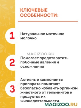- Помогает предотвратить побочные явления и осложнения, возникающие при гибели паразитов в организме, что особенно важно для молодых (щенки и котята), пожилых, беременных, больных и ослабленных животных.