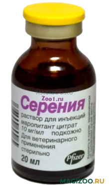 Действующее вещество Серении – маропитанта цитрат – является антагонистом нейрокининовых рецепторов (NK1) и ингибирует связывание субстанции Р, нейтропептида тахикининовой группы в ЦНС. Маропитанта цитрат эффективен при рвоте как центрального, так и периферического генеза. Маропитант быстро всасывается из места инъекции и достигает максимальной концентрации в плазме крови через 45 минут после введения. Маропитант более чем на 99% связывается с белками плазмы крови. Биодоступность Серении составляет 90%. Маропитант метаболизируется в печени цитохромом Р450, выделяется главным образом с фекалиями.