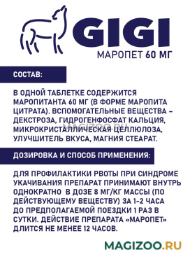 Для профилактики рвоты при синдроме укачивания препарат задают внутрь однократно в дозе 8 мг/кг массы (по действующему веществу) за 1-2 часа до предполагаемой поездки 1 раз в сутки. Действие препарата МароПЕТ длится не менее 12 часов.