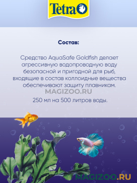 Средство AquaSafe Goldfish делает агрессивную водопроводную воду безопасной и пригодной для рыб, входящие в состав коллоидные вещества обеспечивают защиту плавникам.