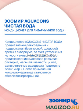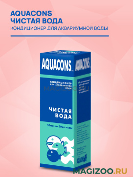 Кондиционер AQUACONS ЧИСТАЯ ВОДА предназначен для создания и поддержания безопасной, здоровой среды в аквариуме, за счет устранения мутности аквариумной воды любого происхождения (массовое развитие бактерий, мельчайшие частицы ила, одноклеточные водоросли, "цветение воды" и др.). После применения кондиционера вода становится абсолютно прозрачной.