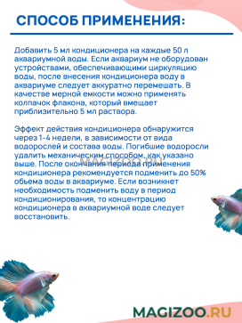 Эффект действия кондиционера обнаружится через 1-4 недели, в зависимости от вида водорослей и состава воды. Погибшие водоросли удалить механическим способом, как указано выше. После окончания периода применения кондиционера рекомендуется подменить до 50% объема воды в аквариуме. Если возникнет необходимость подменить воду в период кондиционирования, то концентрацию кондиционера в аквариумной воде следует восстановить.
