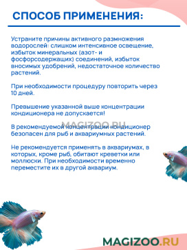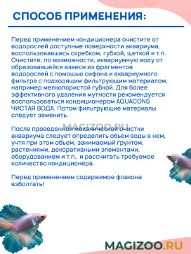 Перед применением кондиционера очистите от водорослей доступные поверхности аквариума, воспользовавшись скребком, губкой, щеткой и т.п. Очистите, по возможности, аквариумную воду от образовавшейся взвеси из фрагментов водорослей с помощью сифона и аквариумного фильтра с подходящим фильтрующим материалом, например мелкопористой губкой. Для более эффективного удаления мутности рекомендуется воспользоваться кондиционером AQUACONS ЧИСТАЯ ВОДА. Потом фильтрующие материалы следует заменить.