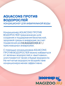 Кондиционер AQUACONS ПРОТИВ ВОДОРОСЛЕЙ предназначен для создания и поддержания безопасной, здоровой среды в аквариуме за счет подавления роста водорослей в пресноводных аквариумах.