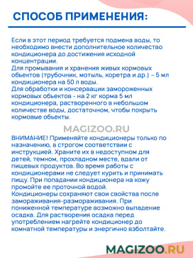Для обработки и консервации замороженных кормовых объектов - на 2 кг корма 5 мл кондиционера, растворенного в небольшом количестве воды, достаточном, чтобы покрыть кормовые объекты.