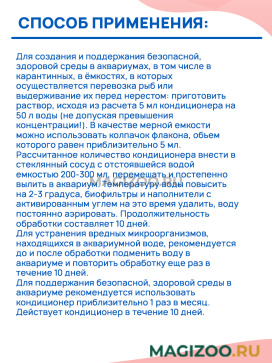 Для создания и поддержания безопасной, здоровой среды в аквариумах, в том числе в карантинных, в ёмкостях, в которых осуществляется перевозка рыб или выдерживание их перед нерестом: приготовить раствор, исходя из расчета 5 мл кондиционера на 50 л воды (не допуская превышения концентрации!). В качестве мерной емкости можно использовать колпачок флакона, объем которого равен приблизительно 5 мл. Рассчитанное количество кондиционера внести в стеклянный сосуд с отстоявшейся водой емкостью 200-300 мл, перемешать и постепенно вылить в аквариум. Температуру воды повысить на 2-3 градуса, биофильтры и наполнители с активированным углем на это время удалить, воду постоянно аэрировать. Продолжительность обработки составляет 10 дней.