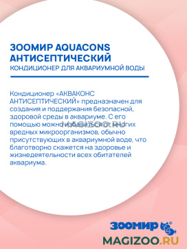 Кондиционер «АКВАКОНС АНТИСЕПТИЧЕСКИЙ» предназначен для создания и поддержания безопасной, здоровой среды в аквариуме. С его помощью можно избавиться от многих вредных микроорганизмов, обычно присутствующих в аквариумной воде, что благотворно скажется на здоровье и жизнедеятельности всех обитателей аквариума.