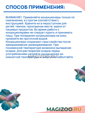 Использую эту водичку постоянно, цвет воды в аквариуме всего от нескольких капелек становится приятного о оттенка. Уничтожаются все плохие микробы, которые вредят здоровью моих рыбок. Рыбки оздоравливаются, поэтому если мне приходится надолго уезжать и за рыбками ухаживает другой член моей семьи, то после приезда я обязательно добавляю в воду этот кондиционер. Рыбки еще ни разу не болели, вода прозрачная. Рыбки чувствуют себя хорошо.