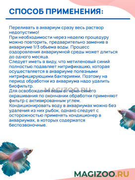 Кондиционер «Метиленовый синий» - раствор метиленового синего - синтетического красителя синего цвета. Предназначен для создания и поддержания в аквариуме безопасной, здоровой среды, препятствующей развитию находящихся в аквариумной воде вредных микроорганизмов, в том числе различных грибков.
